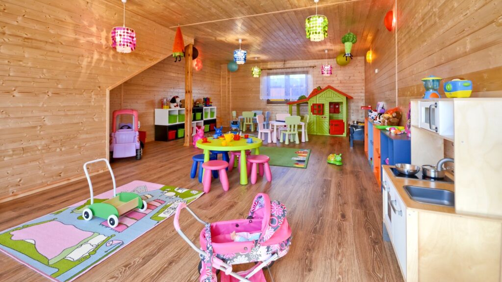 Na piętrze nad salą zabaw znajdują się 2 studia dwupokojowe. Każde studio posiada swoją łazienkę oraz przestronny aneks kuchenny.