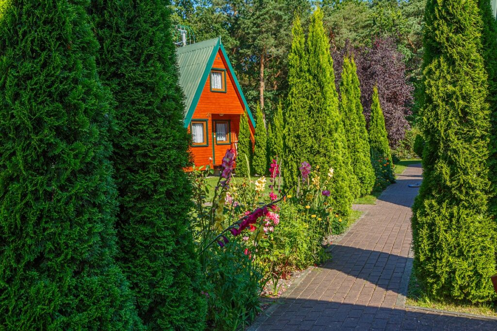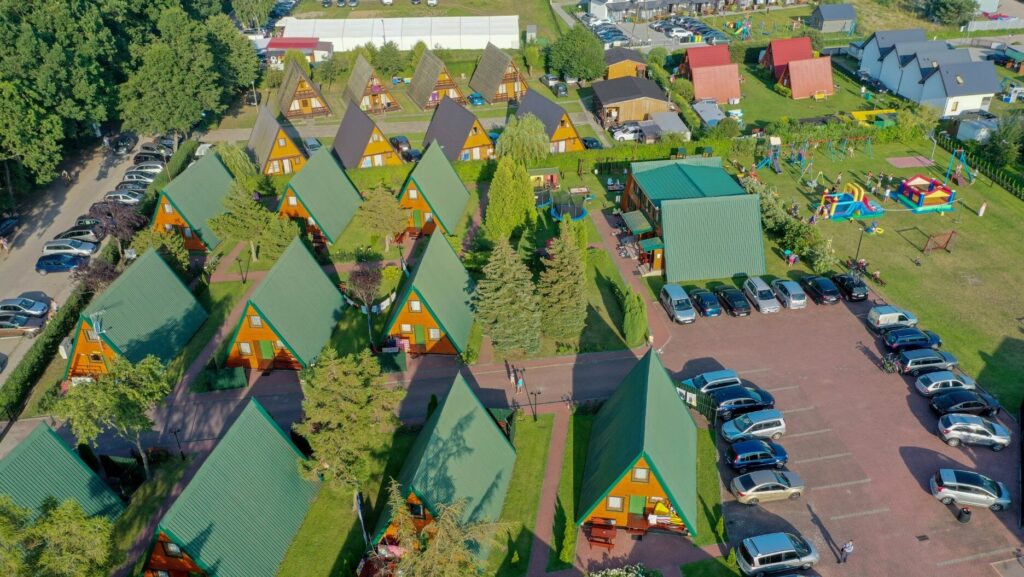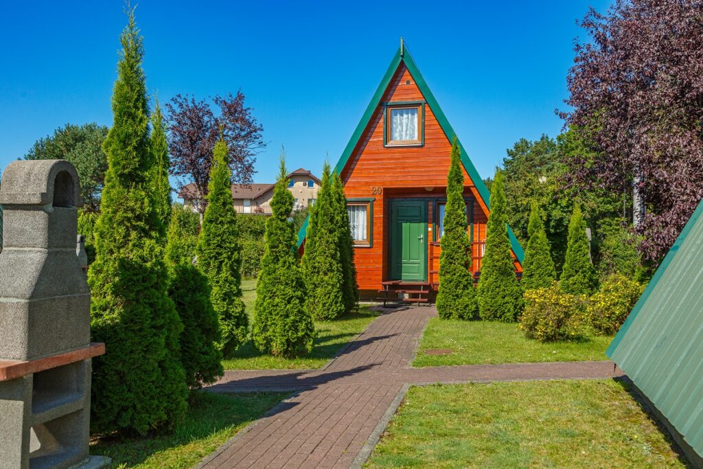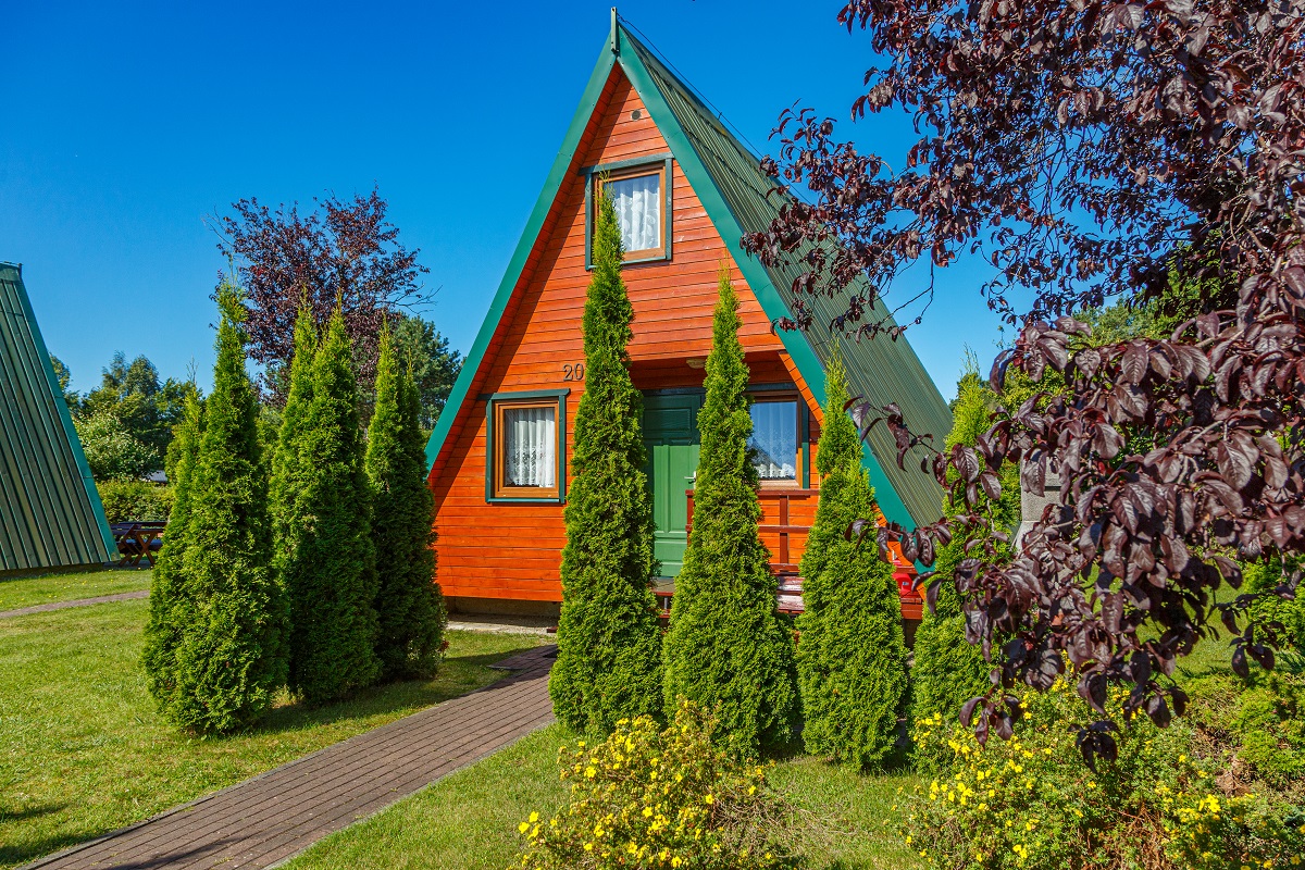 Dwupoziomowe domki letniskowe typu Brda. Za dopłatą możliwy pobyt do 5 osób.