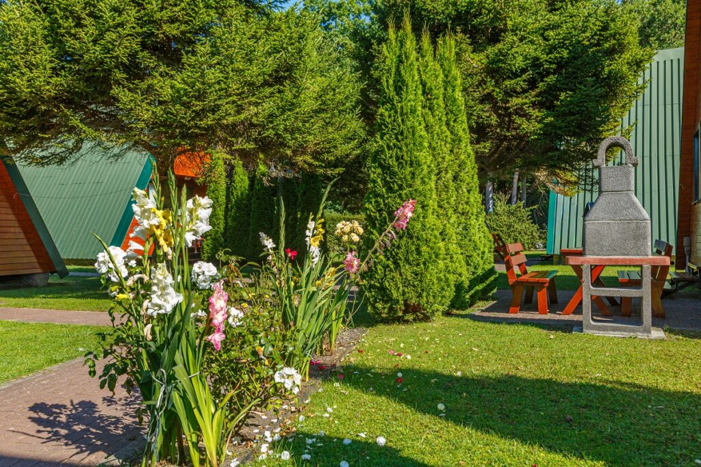 Przed domkiem grill i meble ogrodowe.